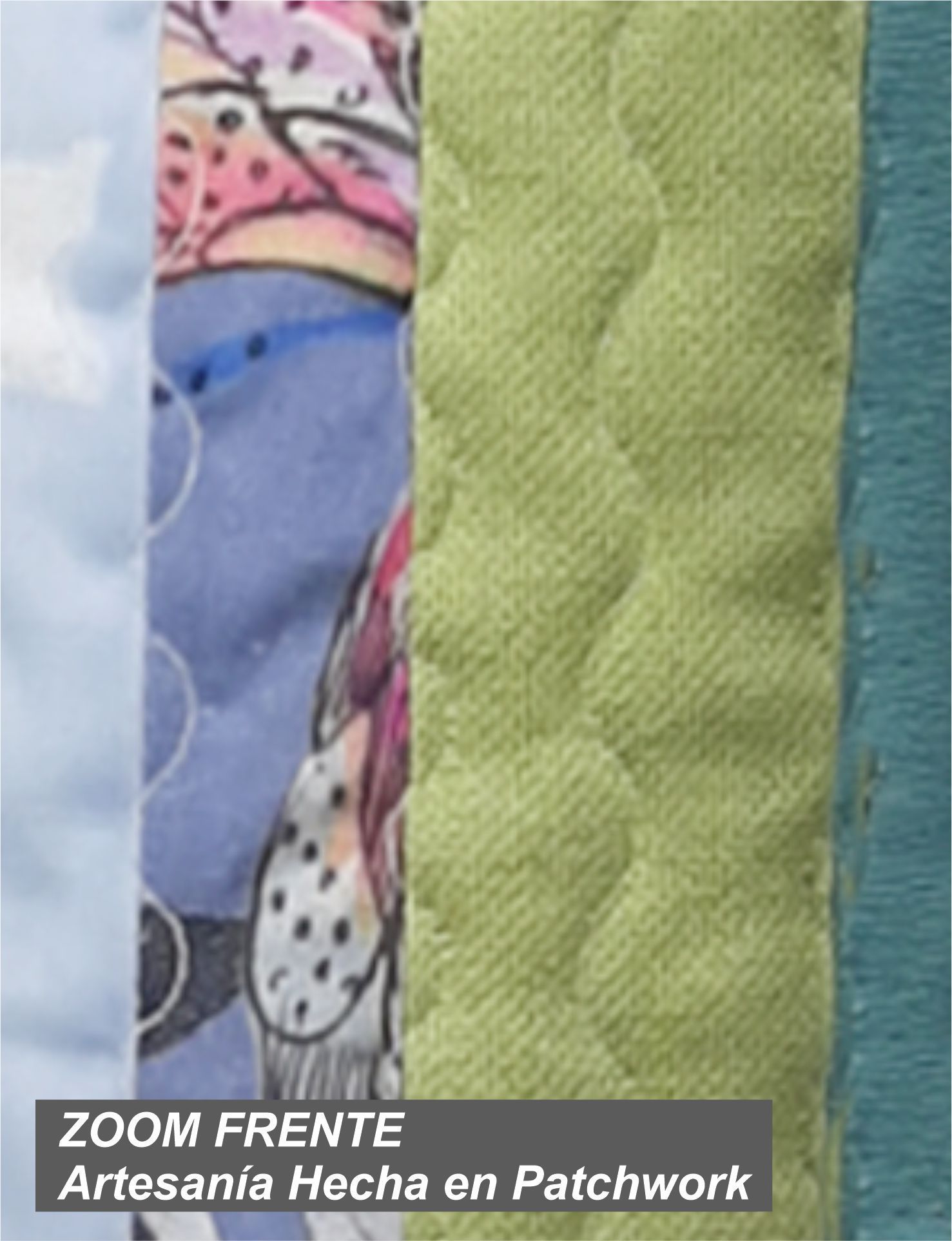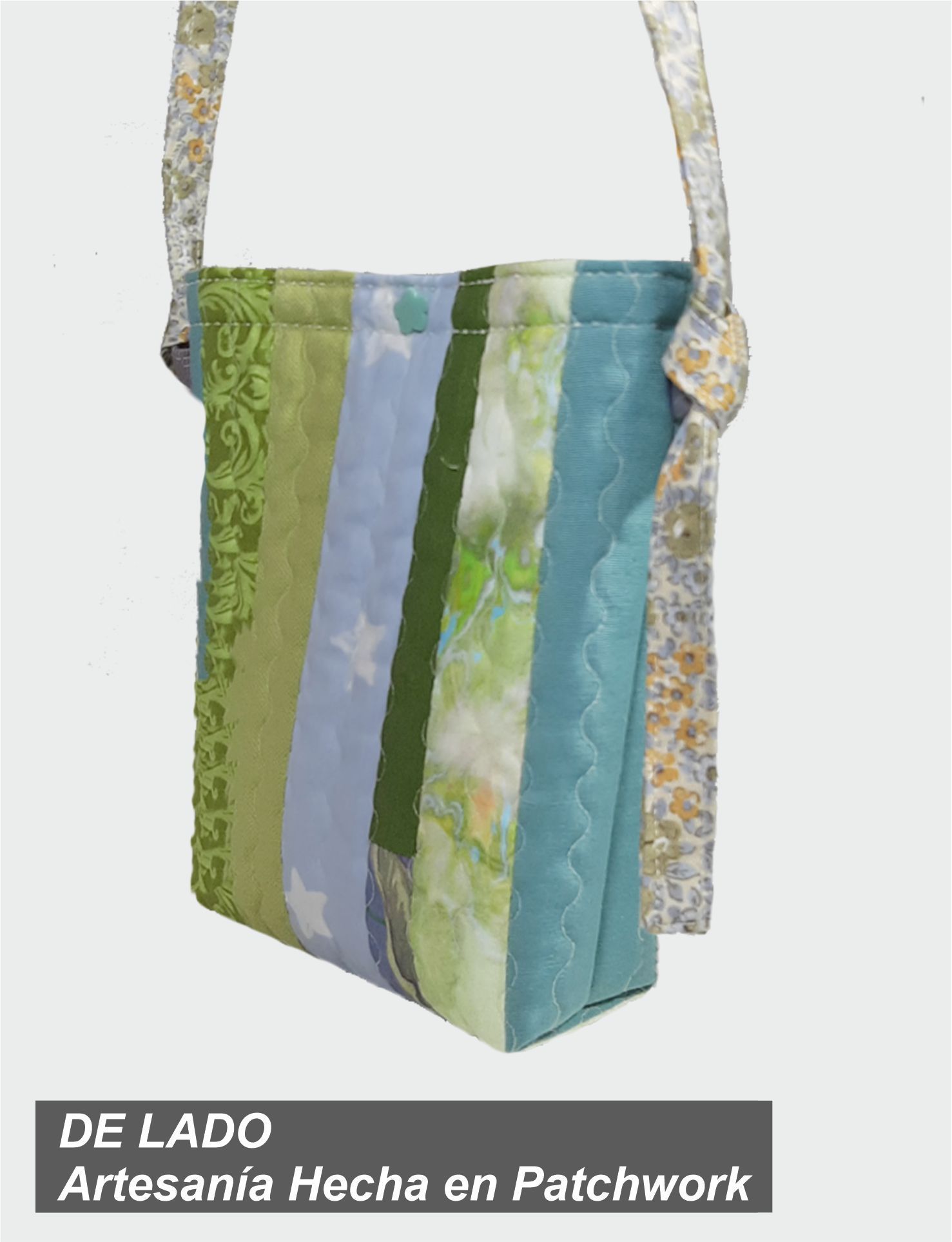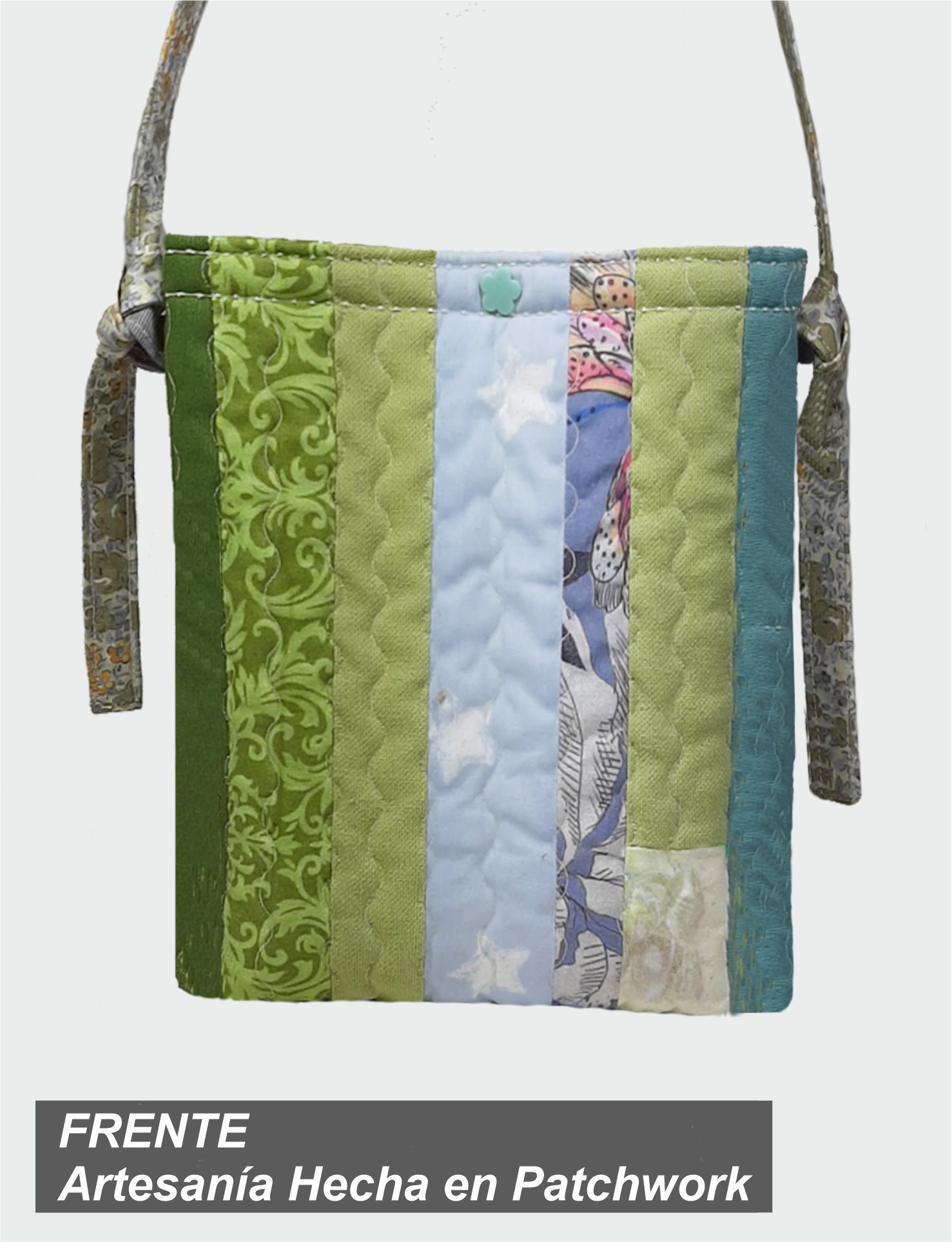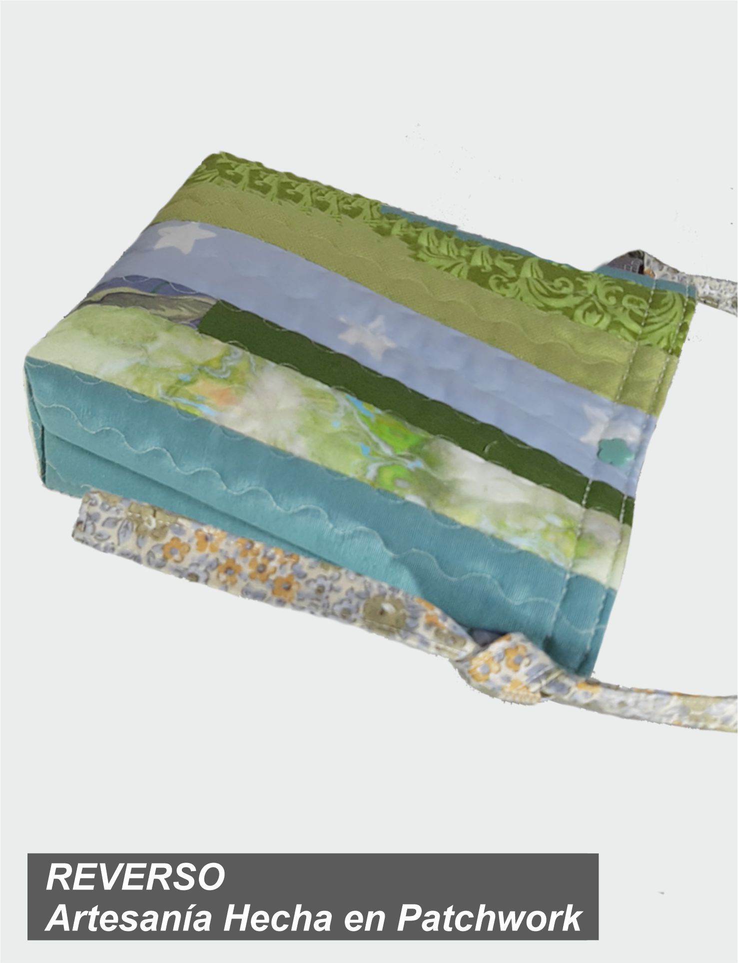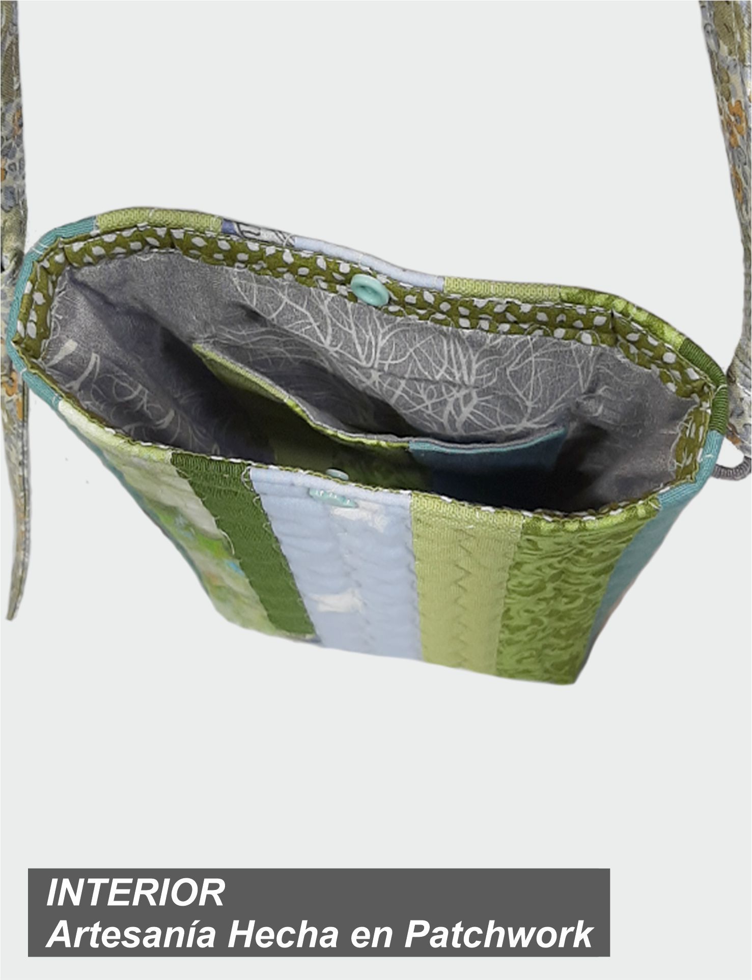 Bolso Patchwork Quilt, gama de verdes y azules con interior estampado y bolsillo en Patchwork.
